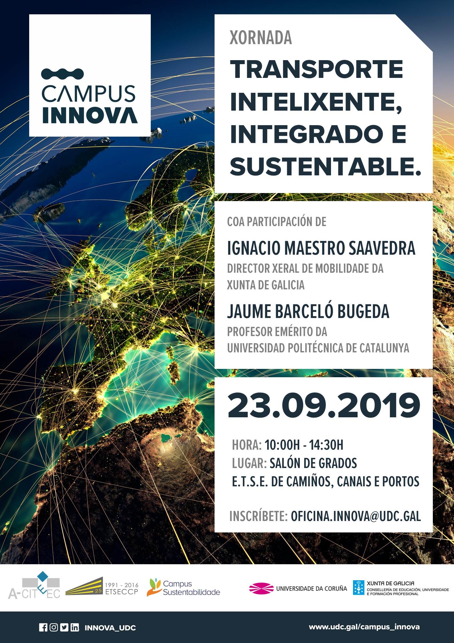 El Campus Innova, con la colaboración de la Agrupación Estratéxica CITEEC y del Campus Sustentabilidade, celebra la jornada “Transporte Inteligente, Integrado y Sostenible” que tendrá lugar el lunes 23 de septiembre a las 10:00 horas en el Salón de Grados de la E.T.S.I. de Caminos, Canales y Puertos.