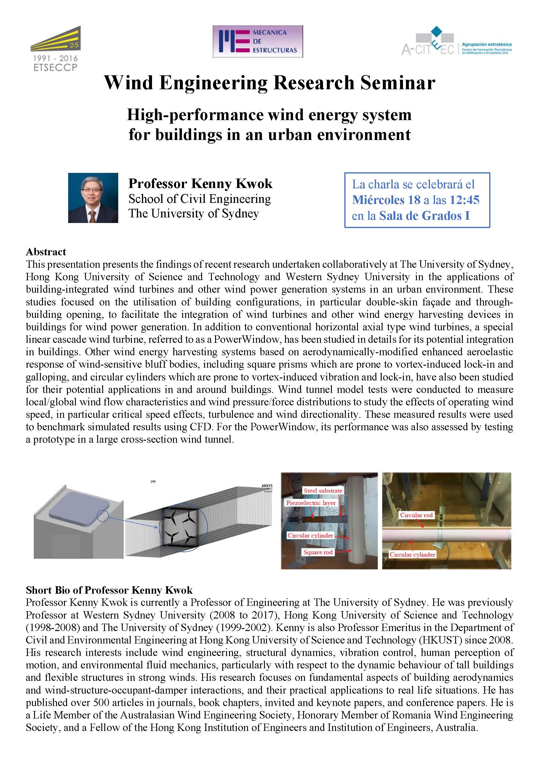 El profesor Kwok es uno de los principales expertos a nivel mundial en ingeniería de viento (este año ha recibido la Medalla Davenport, otorgada por la IAWE, y la Medalla Jack E. Cermak, otorgada por la ASCE), y nos va a presentar la investigación que ha realizado durante los últimos años en generación de energía eólica en entorno urbano.