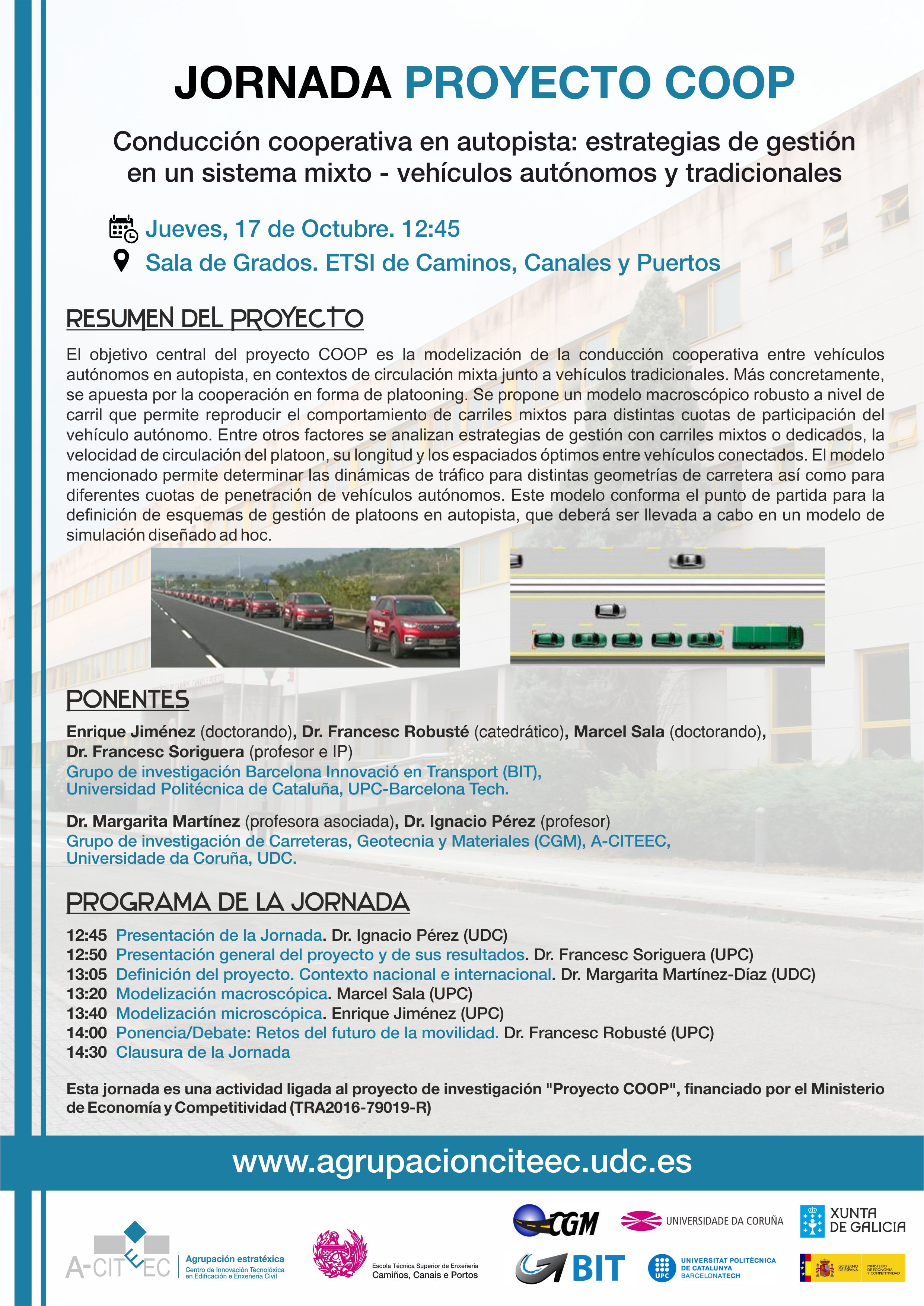 O vindeiro 17 de outubro, na Sala de Graos da ETSE de Camiños, Canais e Portos, celebrarase a xornada sobre o Proxecto COOP “Conducción cooperativa en autopista: estrategias de gestión en un sistema mixto – vehículos autónomos y tradicionales“, organizada pola Agrupación Estratéxica CITEEC en colaboración co Grupo de investigación de Estradas, Xeotecnia e Materiais.