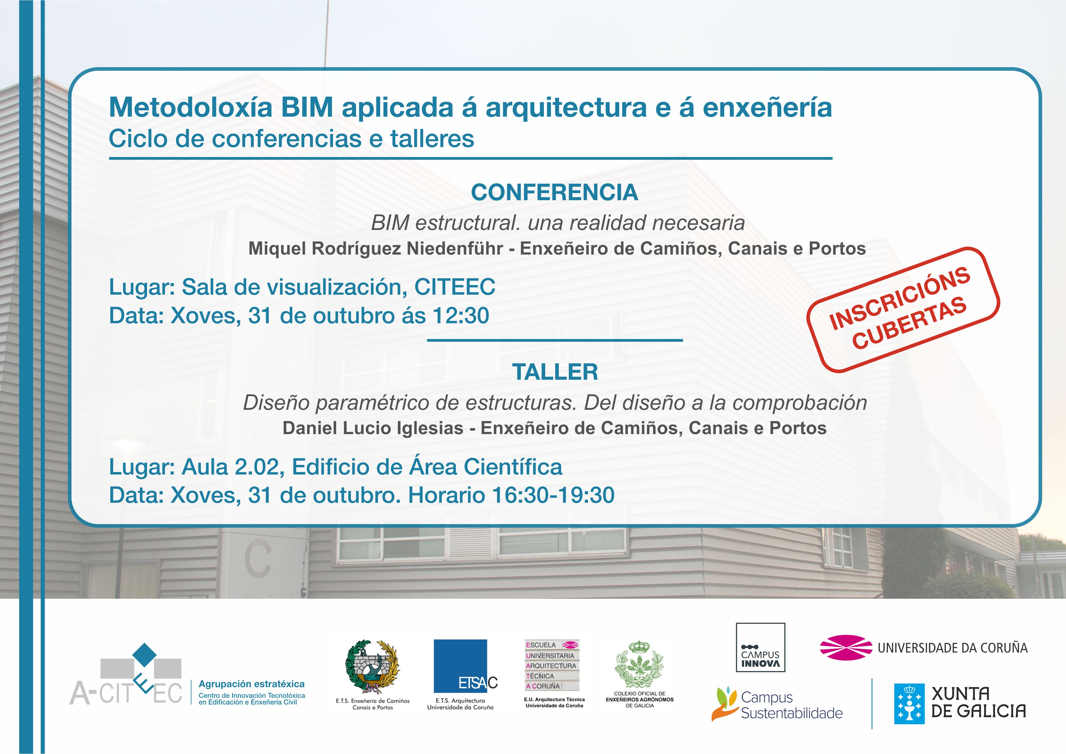 venres 31 de Outubro hai unha nova conferencia + taller do Ciclo “Metodoloxía BIM aplicada á arquitectura e á enxeñería”. A conferencia, titulada “