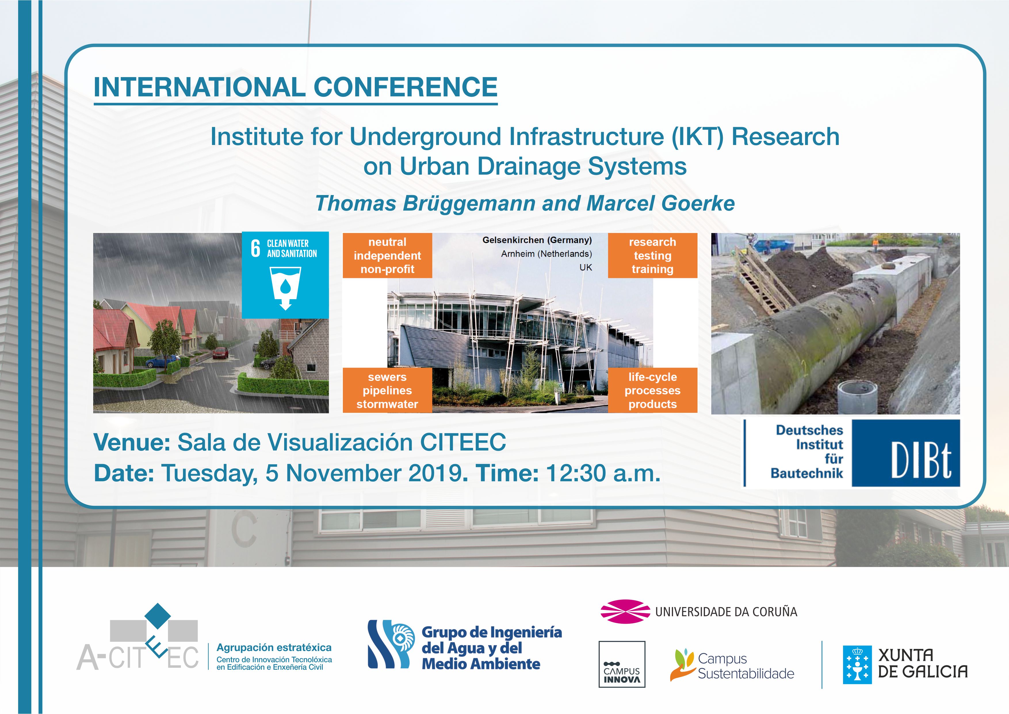 O vindeiro 5 de novembro ás 12:30, na Sala de Visualización do CITEEC, terá lugar a conferencia “Institute for Underground Infrastructure (IKT). Research on Urban Drainage Systems“, organizada pola Agrupación Estratéxica CITEEC en colaboración co GEAMA.