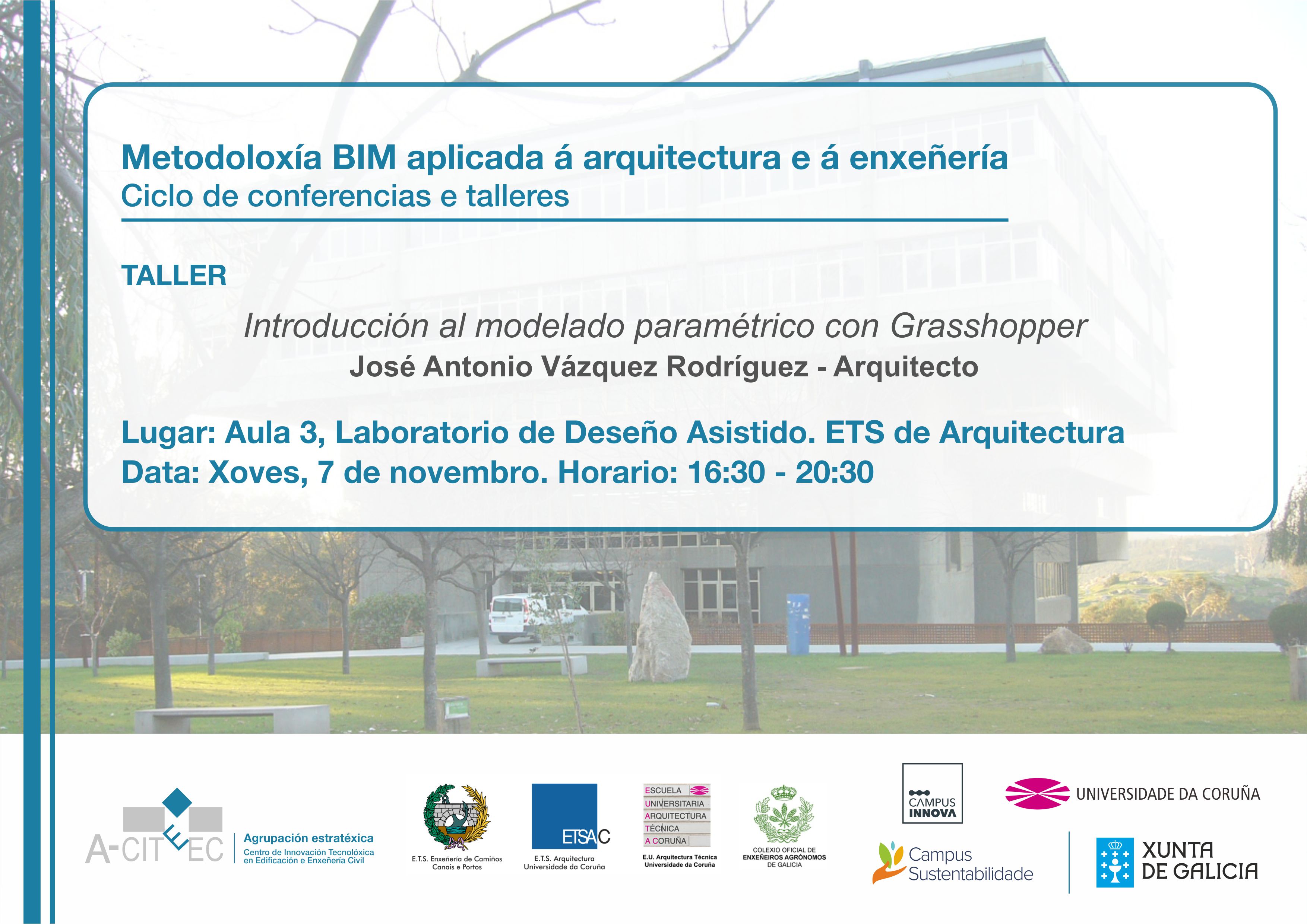 O vindeiro xoves 7 de Novembro hai un novo taller do Ciclo “Metodoloxía BIM aplicada á arquitectura e á enxeñería”. O taller, titulado “Introducción al modelado paramétrico con Grasshopper“, será impartida por José Antonio Vázquez Rodríguez (Arquitecto) na Aula 3 do Laboratorio de Deseño Asistido da ETS. de Arquitectura (5º andar). O horario do taller será de 16:30 a 20:30.