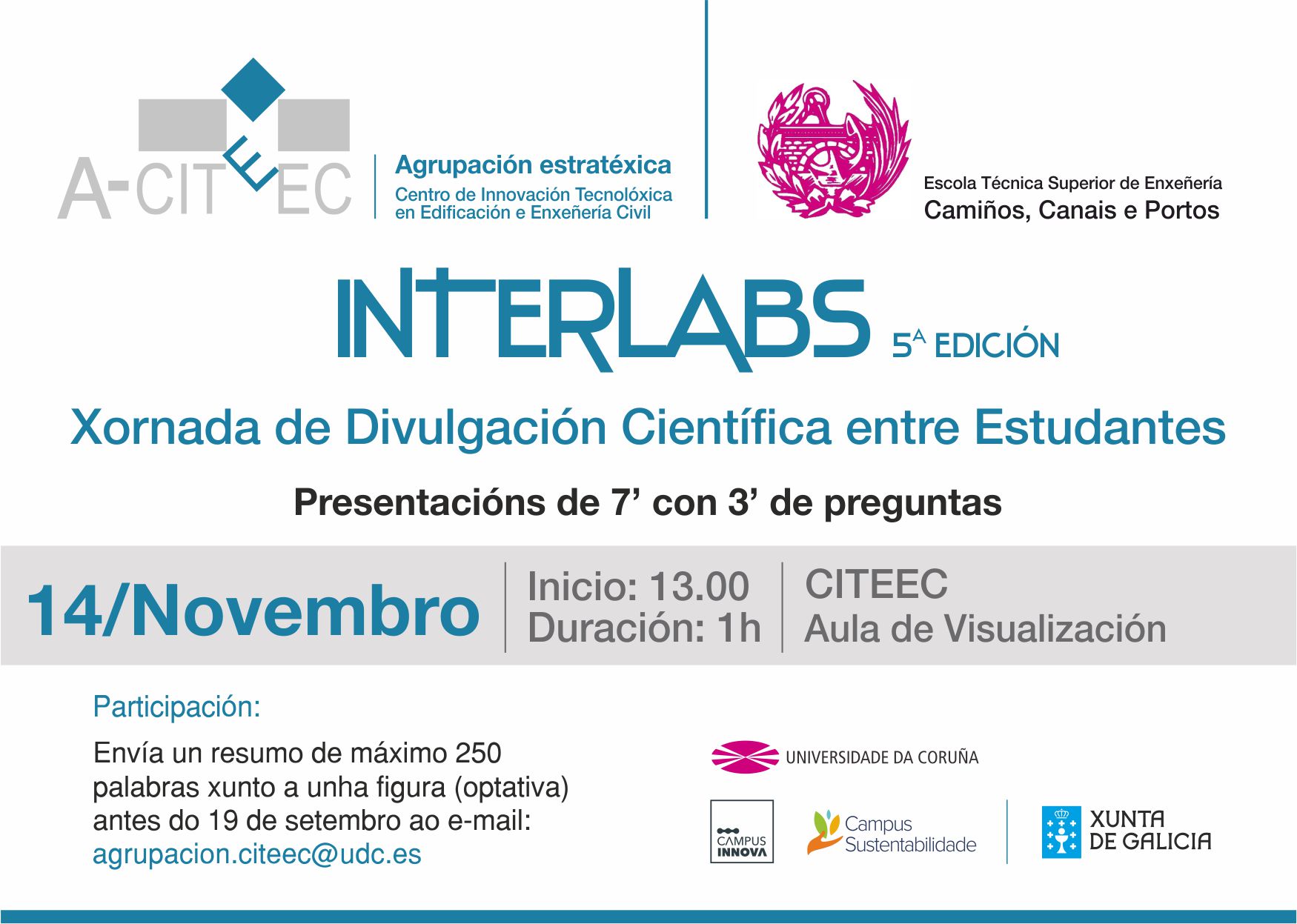 A Agrupación Estratéxica CITEEC xunto ca Escola de Enxeñería de Camiños, Canais e Portos da UDC organizan a quinta edición da Xornada de Divulgación Científica entre Estudantes INTERLABS no Centro de Innovación Tecnolóxica en Edificación e Enxeñería Civil (CITEEC). Esta xornada celebrarase o vindeiro 14 de Novembro na Sala de Visualización do CITEEC ás 13:00 e terá unha hora de duración.