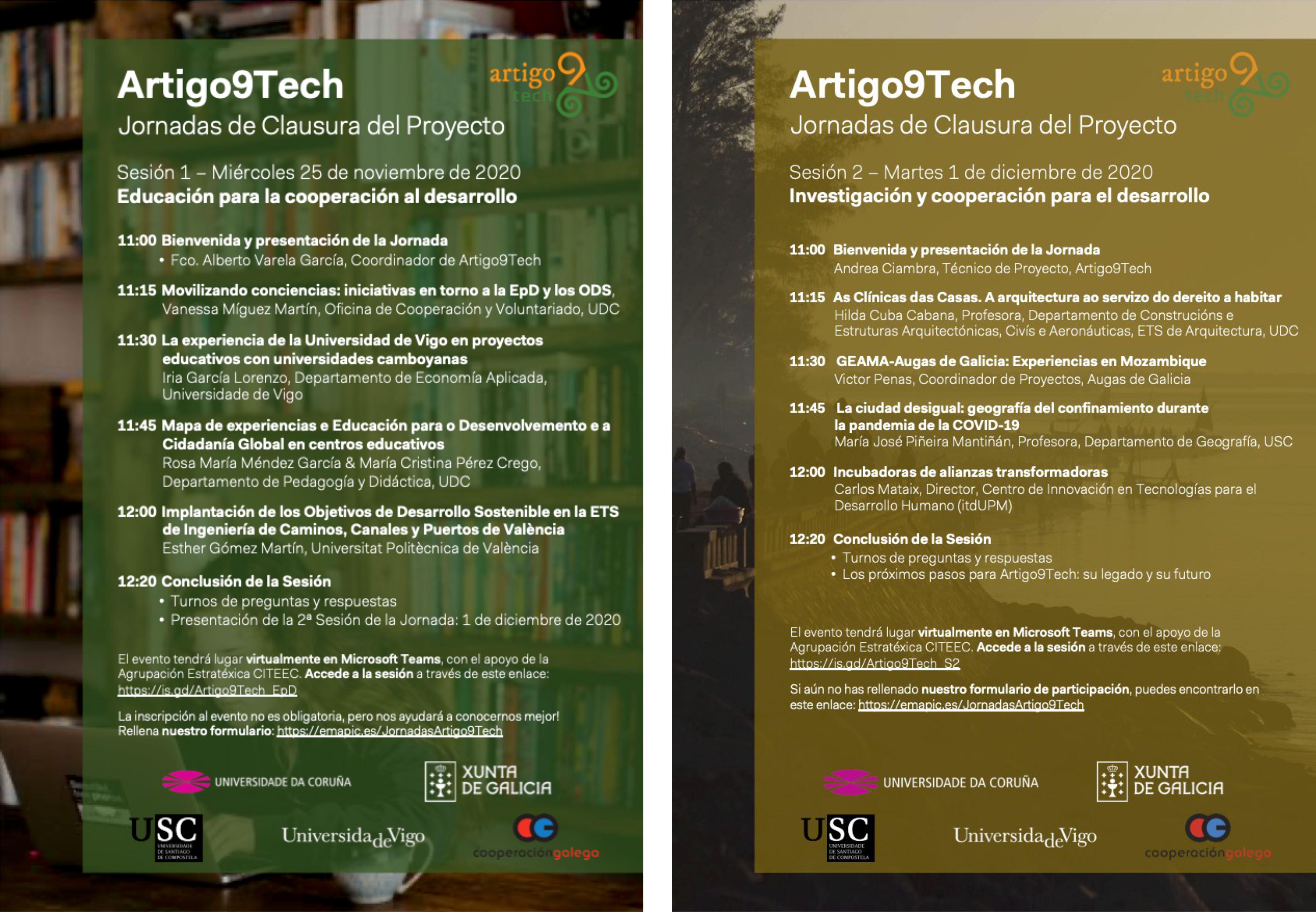 Para celebrar os resultados e os avances da rede, Artigo9Tech reúnese coa súa comunidade e abre (de forma virtual) as portas da súa rede en dúas sesións de peche, as Xornadas de Clausura de Artigo9Tech. A primeira sesión, que terá lugar online o mércores 25 de novembro de 2020, ás 11:00, centrarase na educación para a cooperación ao desenvolvemento. Mentres a segunda sesión, terá lugar online o martes 1 de decembro de 2020, ás 11:00, e centrarase no papel da investigación para a cooperación ao desenvolvemento. Ambas sesións terán lugar a través da plataforma Teams, co apoio técnico da Agrupación Estratéxica CITEEC. Incluirán presentacións dos membros da Rede e presentación invitadas: o obxectivo non é só comunicar os logros e os resultados dos proxectos dos seus integrantes, senón ter unha oportunidade máis de crear rede e facer equipo con outras persoas que traballen nos mesmos temas e se aproximen a eles desde unha perspectiva compartida (outras comunidades, outras universidades ou outros eidos).